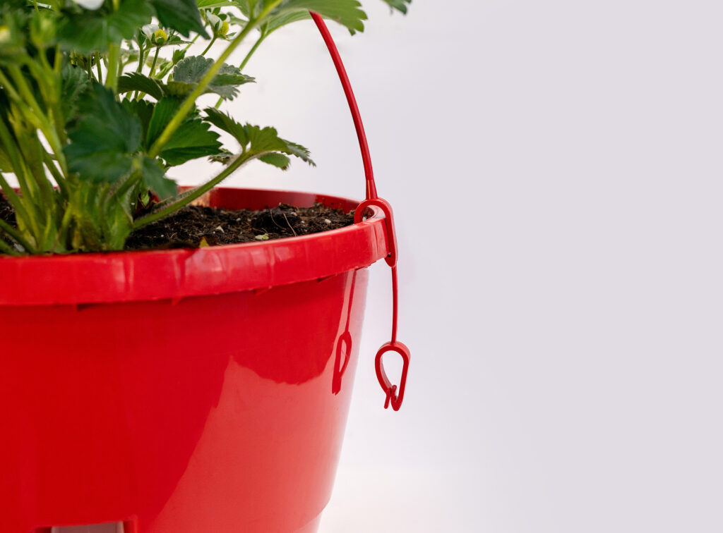 De P23 hangpot is onze kleinste hanging basket en heeft een inhoud van ongeveer 5 liter. De opvallende rode pot heeft een klein waterreservoir en is veelal voorzien van het kwalitatief hoogwaardige ras Favori, op dit moment binnen Europa 1 van de beste doordragende aardbeienrassen met heerlijke zoete aardbeien.